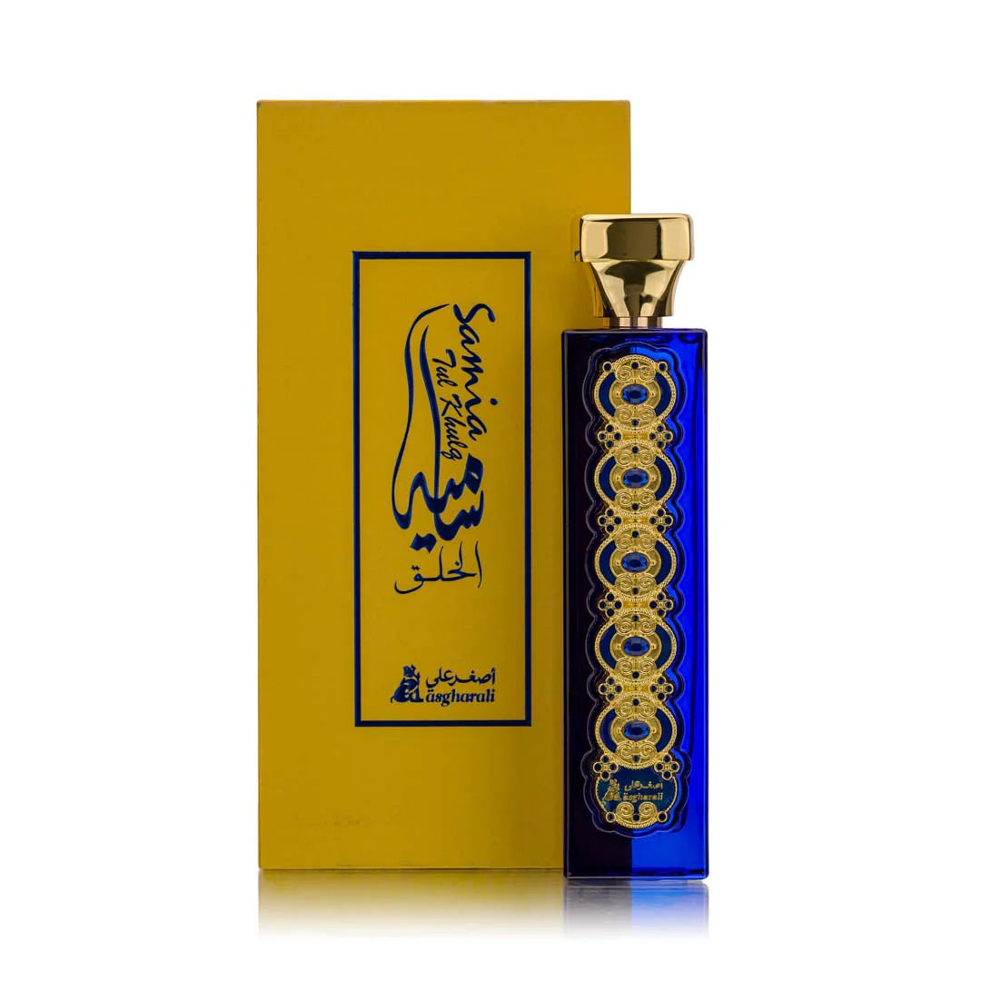 SAMIA TUL KHULQ is the epitome of all things nice. The fragrance itself has a dreamy ambience of Oriental, Floral, Ambery leaving you in a wonderland from its top note of rose saffron and red fruits a pleasant combination to awe any women. Heart notes consists of woody texture base. Dry amber musk and vanilla gives it staying power that will ensure to compliment all day. Presented in an elongated bottle Prussian blue with perfume capacity of 100ml.